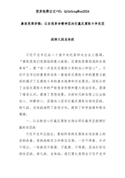 【七哥公文】2025年:廉政党课讲稿:以自我革命精神坚决打赢反腐败斗争攻坚战持久战总体战+更多免费公文+VX:QiGeGongWen2024+更多免费公文+VX:QiGeGongWen2024