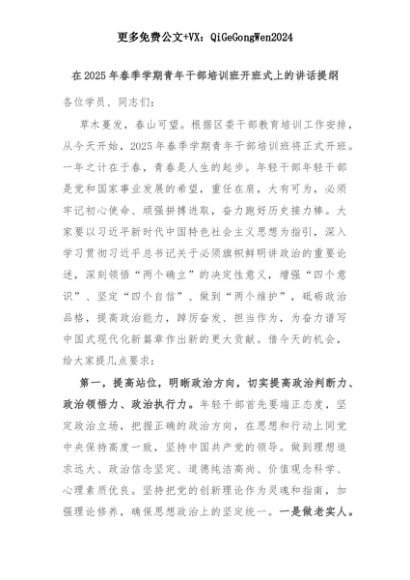 【七哥公文】2025年:在2025年春季学期青年干部培训班开班式上的讲话提纲+更多免费公文+VX:QiGeGongWen2024+更多免费公文+VX:QiGeGongWen2024
