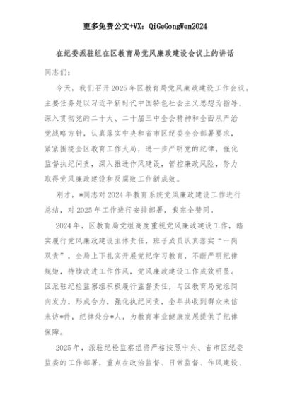 【七哥公文】2025年:在纪委派驻组在区教育局党风廉政建设会议上的讲话+更多免费公文+VX:QiGeGongWen2024+更多免费公文+VX:QiGeGongWen2024