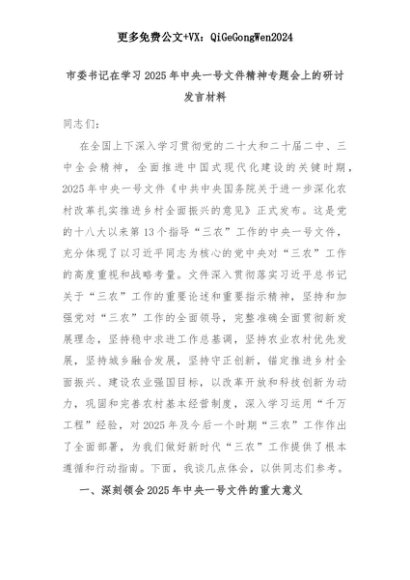 【七哥公文】2025年:市委书记在学习2025年中央一号文件精神专题会上的研讨发言材料+更多免费公文+VX:QiGeGongWen2024+更多免费公文+VX:QiGeGongWen2024