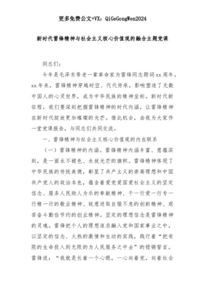 【七哥公文】2025年:新时代雷锋精神与社会主义核心价值观的融合主题党课+更多免费公文+VX:QiGeGongWen2024+更多免费公文+VX:QiGeGongWen2024