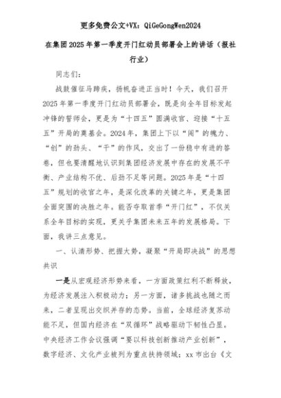 【七哥公文】2025年:在集团2025年第一季度开门红动员部署会上的讲话(报社行业)+更多免费公文+VX:QiGeGongWen2024+更多免费公文+VX:QiGeGongWen2024