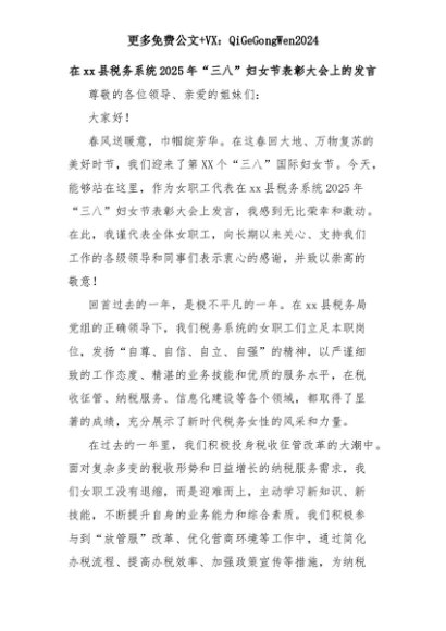 【七哥公文】2025年:在xx县税务系统2025年“三八”妇女节表彰大会上的发言+更多免费公文+VX:QiGeGongWen2024+更多免费公文+VX:QiGeGongWen2024