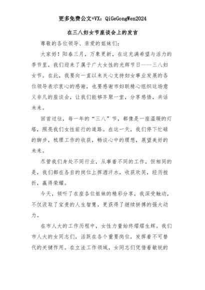 【七哥公文】2025年:在三八妇女节座谈会上的发言+更多免费公文+VX:QiGeGongWen2024+更多免费公文+VX:QiGeGongWen2024