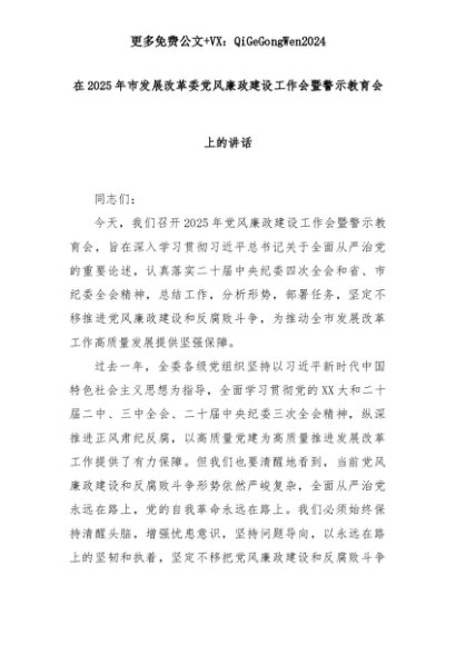 【七哥公文】2025年:在2025年市发展改革委党风廉政建设工作会暨警示教育会上的讲话+更多免费公文+VX:QiGeGongWen2024+更多免费公文+VX:QiGeGongWen2024