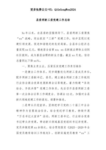 【七哥公文】2025年:县委两新工委党建工作总结+更多免费公文+VX:QiGeGongWen2024+更多免费公文+VX:QiGeGongWen2024