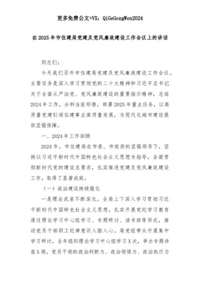 【七哥公文】2025年:在2025年市住建局党建及党风廉政建设工作会议上的讲话+更多免费公文+VX:QiGeGongWen2024+更多免费公文+VX:QiGeGongWen2024