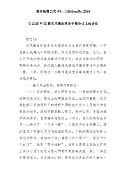 【七哥公文】2025年:在2025年XX镇党风廉政建设专题会议上的讲话+更多免费公文+VX:QiGeGongWen2024+更多免费公文+VX:QiGeGongWen2024