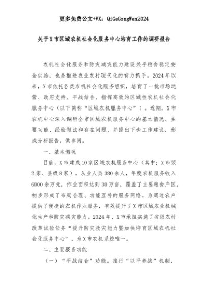 【七哥公文】2025年:关于X市区域农机社会化服务中心培育工作的调研报告+更多免费公文+VX:QiGeGongWen2024+更多免费公文+VX:QiGeGongWen2024