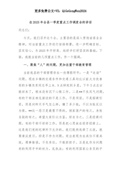【七哥公文】2025年:在2025年全县一季度重点工作调度会的讲话+更多免费公文+VX:QiGeGongWen2024+更多免费公文+VX:QiGeGongWen2024