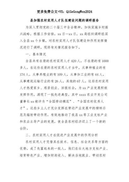 【七哥公文】2025年:县加强农村实用人才队伍建设问题的调研报告+更多免费公文+VX:QiGeGongWen2024+更多免费公文+VX:QiGeGongWen2024