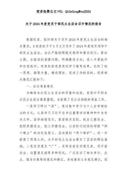 【七哥公文】2025年:关于2024年度党员干部民主生活会召开情况的报告+更多免费公文+VX:QiGeGongWen2024+更多免费公文+VX:QiGeGongWen2024