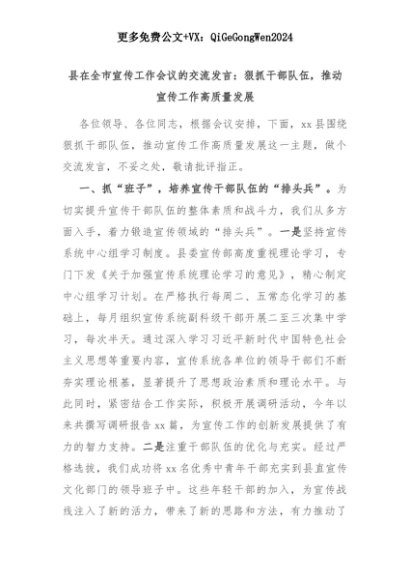 【七哥公文】2025年:县在全市宣传工作会议的交流发言:狠抓干部队伍,推动宣传工作高质量发展+更多免费公文+VX:QiGeGongWen2024+更多免费公文+VX:QiGeGongWen2024