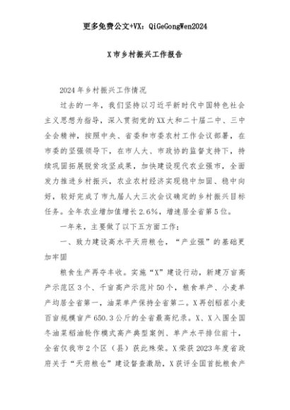 【七哥公文】2025年:X市乡村振兴工作报告+更多免费公文+VX:QiGeGongWen2024+更多免费公文+VX:QiGeGongWen2024