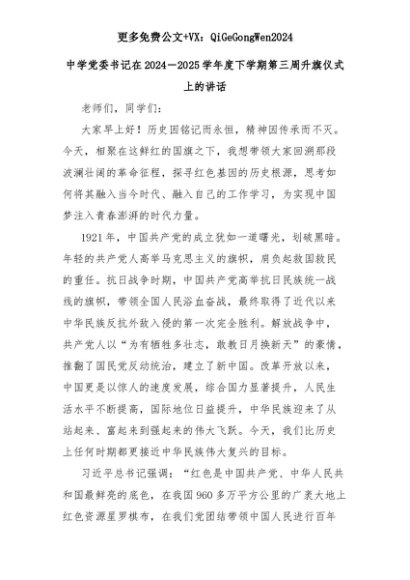 【七哥公文】2025年:中学党委书记在2024-2025学年度下学期第三周升旗仪式上的讲话+更多免费公文+VX:QiGeGongWen2024+更多免费公文+VX:QiGeGongWen2024