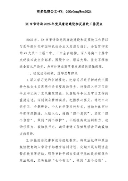 【七哥公文】2025年:XX市审计局2025年党风廉政建设和反腐败工作要点+更多免费公文+VX:QiGeGongWen2024+更多免费公文+VX:QiGeGongWen2024