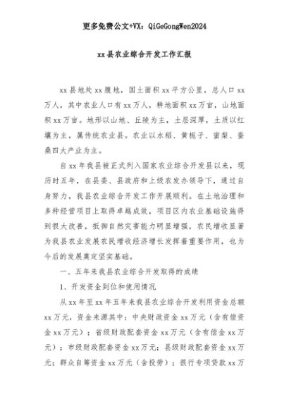 【七哥公文】2025年:xx县农业综合开发工作汇报+更多免费公文+VX:QiGeGongWen2024+更多免费公文+VX:QiGeGongWen2024