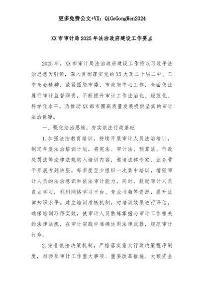 【七哥公文】2025年:XX市审计局2025年法治政府建设工作要点+更多免费公文+VX:QiGeGongWen2024+更多免费公文+VX:QiGeGongWen2024