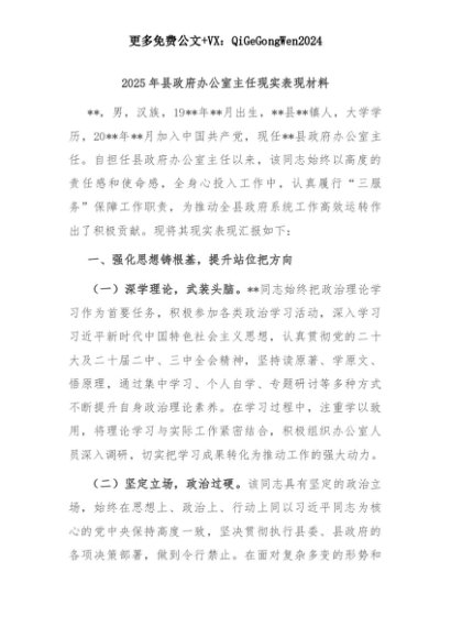 【七哥公文】2025年:2025年县政府办公室主任现实表现材料+更多免费公文+VX:QiGeGongWen2024+更多免费公文+VX:QiGeGongWen2024
