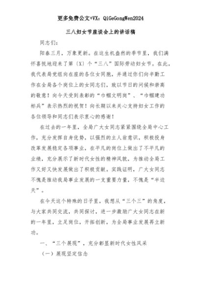 【七哥公文】2025年:三八妇女节座谈会上的讲话稿+更多免费公文+VX:QiGeGongWen2024+更多免费公文+VX:QiGeGongWen2024