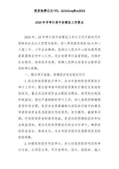 【七哥公文】2025年:2025年市审计局平安建设工作要点+更多免费公文+VX:QiGeGongWen2024+更多免费公文+VX:QiGeGongWen2024