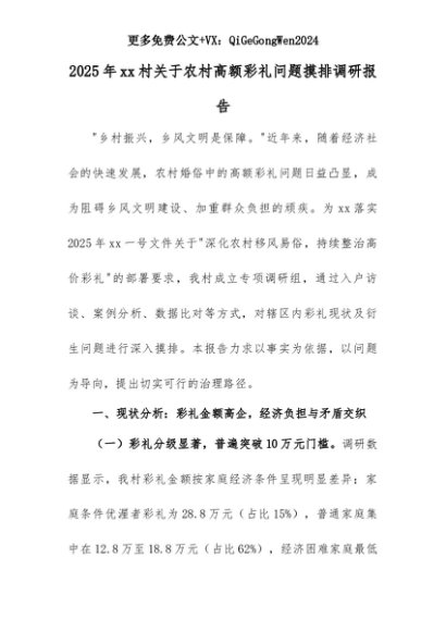 【七哥公文】2025年:2025年xx村关于农村高额彩礼问题摸排调研报告+更多免费公文+VX:QiGeGongWen2024+更多免费公文+VX:QiGeGongWen2024