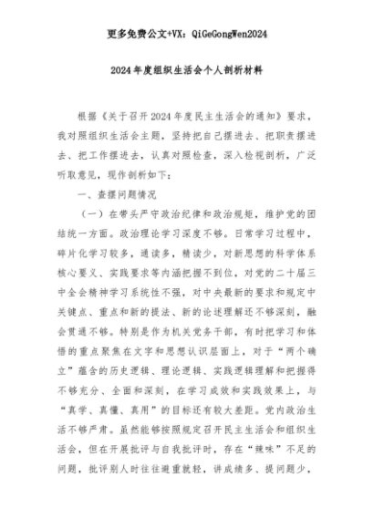 【七哥公文】2025年:2024年度组织生活会个人剖析材料+更多免费公文+VX:QiGeGongWen2024+更多免费公文+VX:QiGeGongWen2024