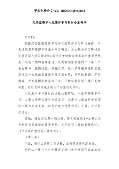 【七哥公文】2025年:纪委监委中心组集体学习研讨会主持词+更多免费公文+VX:QiGeGongWen2024+更多免费公文+VX:QiGeGongWen2024
