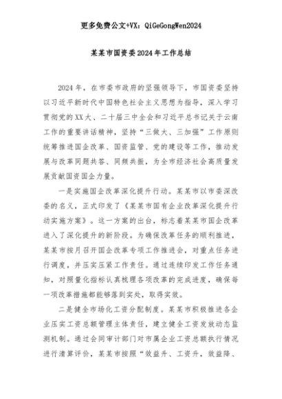 【七哥公文】2025年:某某市国资委2024年工作总结+更多免费公文+VX:QiGeGongWen2024+更多免费公文+VX:QiGeGongWen2024
