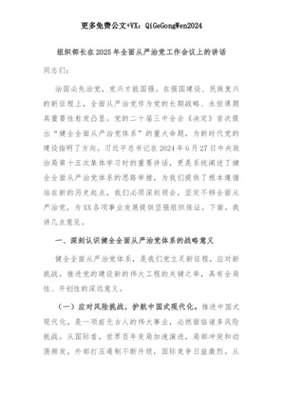 【七哥公文】2025年:组织部长在2025年全面从严治党工作会议上的讲话+更多免费公文+VX:QiGeGongWen2024+更多免费公文+VX:QiGeGongWen2024