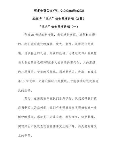 【七哥公文】2025年:(3篇)2025年“三八”妇女节演讲稿+更多免费公文+VX:QiGeGongWen2024+更多免费公文+VX:QiGeGongWen2024