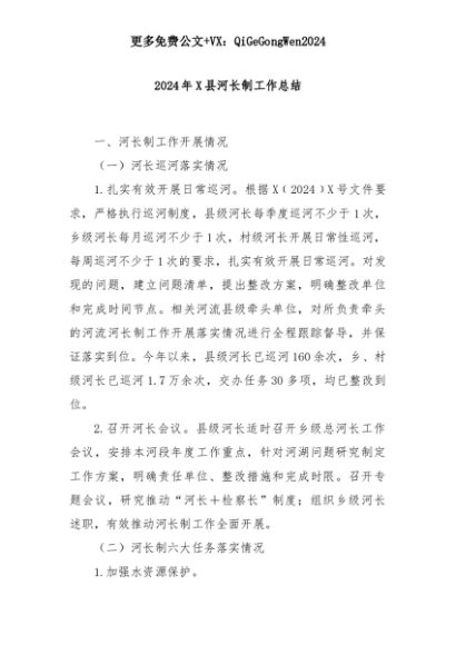 【七哥公文】2025年:2024年X县河长制工作总结+更多免费公文+VX:QiGeGongWen2024+更多免费公文+VX:QiGeGongWen2024