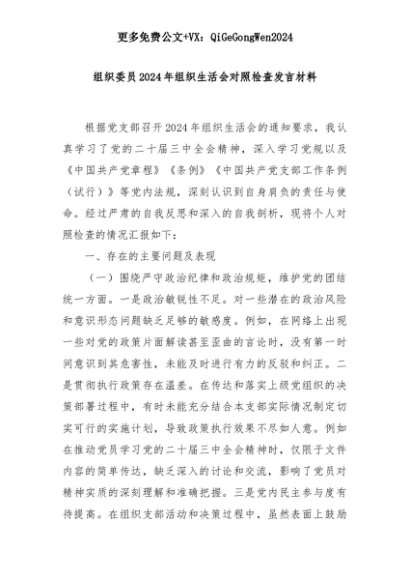 【七哥公文】2025年:组织委员2024年组织生活会对照检查发言材料+更多免费公文+VX:QiGeGongWen2024+更多免费公文+VX:QiGeGongWen2024
