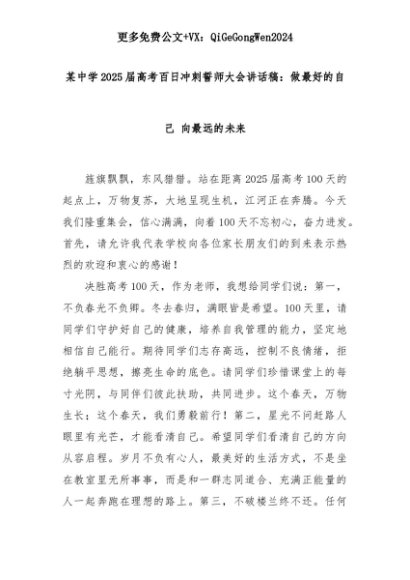 【七哥公文】2025年:某中学2025届高考百日冲刺誓师大会讲话稿:做最好的自己 向最远的未来+更多免费公文+VX:QiGeGongWen2024+更多免费公文+VX:QiGeGongWen2024