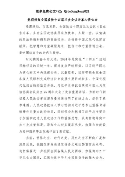 【七哥公文】2025年:热烈祝贺全国政协十四届三次会议开幕心得体会+更多免费公文+VX:QiGeGongWen2024+更多免费公文+VX:QiGeGongWen2024