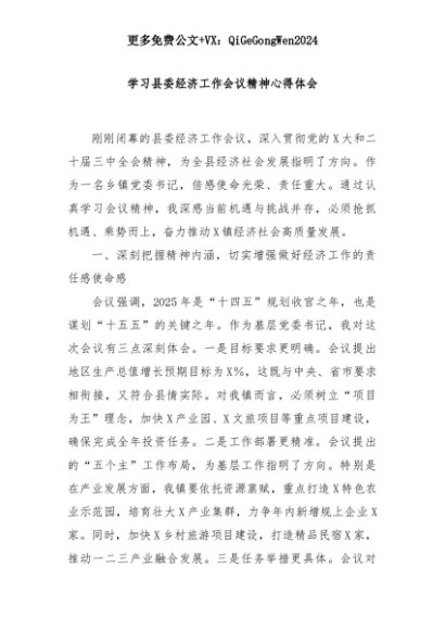 【七哥公文】2025年:学习县委经济工作会议精神心得体会+更多免费公文+VX:QiGeGongWen2024+更多免费公文+VX:QiGeGongWen2024