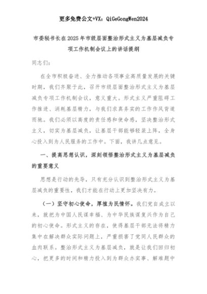 【七哥公文】2025年:市委秘书长在2025年市级层面整治形式主义为基层减负专项工作机制会议上的讲话提纲+更多免费公文+VX:QiGeGongWen2024+更多免费公文+VX:QiGeGongWen2024