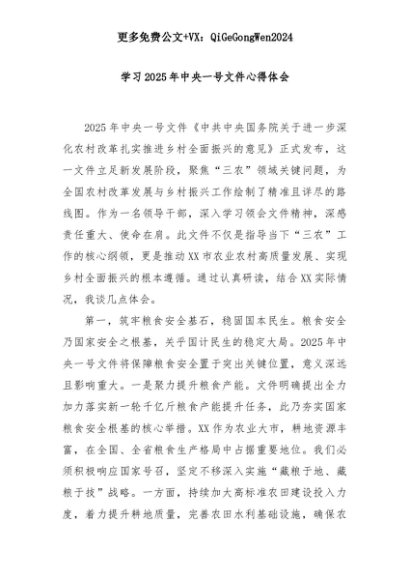 【七哥公文】2025年:学习2025年中央一号文件心得体会+更多免费公文+VX:QiGeGongWen2024+更多免费公文+VX:QiGeGongWen2024