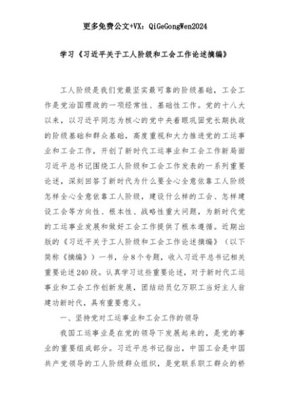 【七哥公文】2025年:学习《总书记关于工人阶级和工会工作论述摘编》+更多免费公文+VX:QiGeGongWen2024+更多免费公文+VX:QiGeGongWen2024