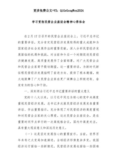 【七哥公文】2025年:学习贯彻民营企业座谈会精神心得体会+更多免费公文+VX:QiGeGongWen2024+更多免费公文+VX:QiGeGongWen2024