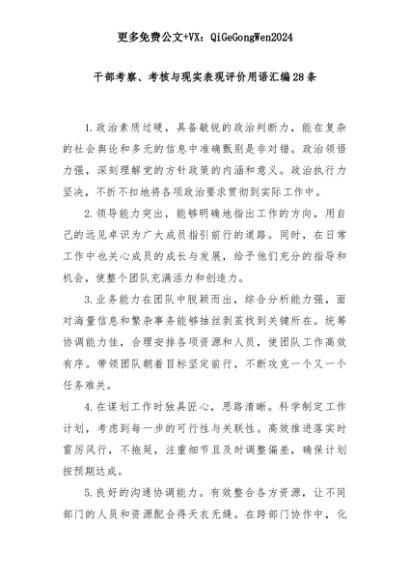 【七哥公文】2025年:干部考察、考核与现实表现评价用语汇编28条+更多免费公文+VX:QiGeGongWen2024+更多免费公文+VX:QiGeGongWen2024