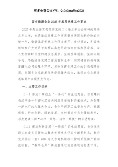 【七哥公文】2025年:国有能源企业2025年基层党建工作要点+更多免费公文+VX:QiGeGongWen2024+更多免费公文+VX:QiGeGongWen2024