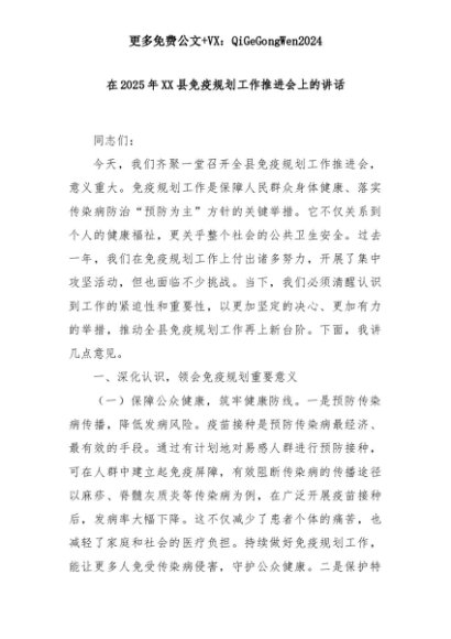 【七哥公文】2025年:在2025年XX县免疫规划工作推进会上的讲话+更多免费公文+VX:QiGeGongWen2024+更多免费公文+VX:QiGeGongWen2024
