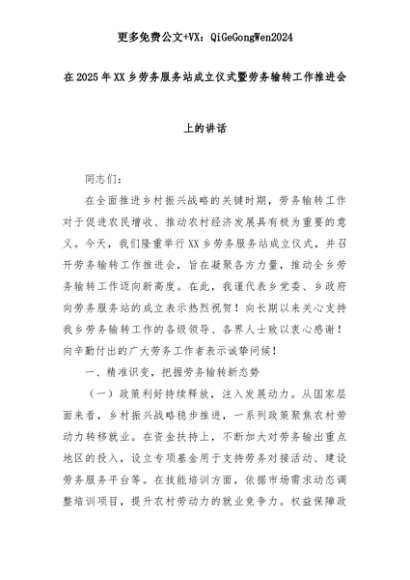 【七哥公文】2025年:在2025年XX乡劳务服务站成立仪式暨劳务输转工作推进会上的讲话+更多免费公文+VX:QiGeGongWen2024+更多免费公文+VX:QiGeGongWen2024