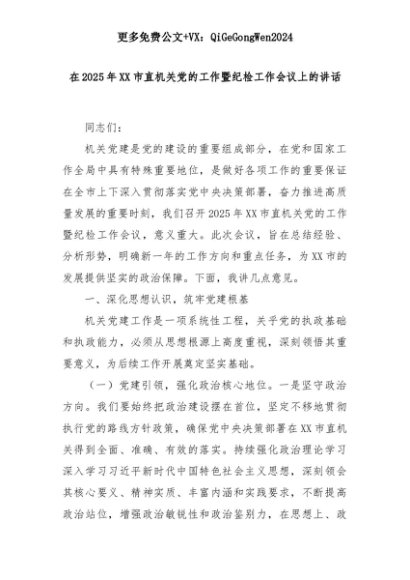 【七哥公文】2025年:在2025年XX市直机关党的工作暨纪检工作会议上的讲话+更多免费公文+VX:QiGeGongWen2024+更多免费公文+VX:QiGeGongWen2024