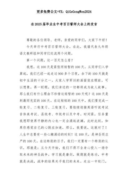 【七哥公文】2025年:在2025届毕业生中考百日誓师大会上的发言+更多免费公文+VX:QiGeGongWen2024+更多免费公文+VX:QiGeGongWen2024