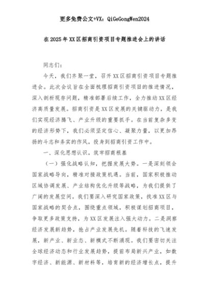 【七哥公文】2025年:在2025年XX区招商引资项目专题推进会上的讲话+更多免费公文+VX:QiGeGongWen2024+更多免费公文+VX:QiGeGongWen2024