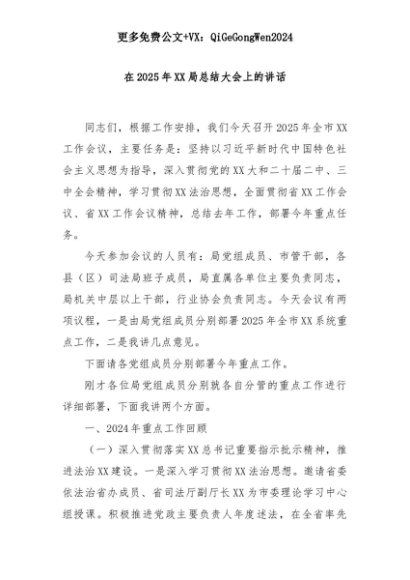 【七哥公文】2025年:在2025年XX局总结大会上的讲话+更多免费公文+VX:QiGeGongWen2024+更多免费公文+VX:QiGeGongWen2024