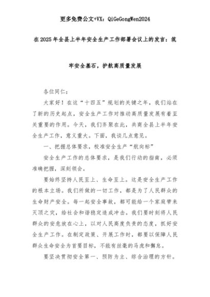 【七哥公文】2025年:在2025年全县上半年安全生产工作部署会议上的发言:筑牢安全基石,护航高质量发展+更多免费公文+VX:QiGeGongWen2024+更多免费公文+VX:QiGeGongWen2024