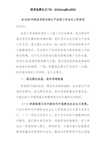 【七哥公文】2025年:在2025年统战系统全面从严治党工作会议上的讲话+更多免费公文+VX:QiGeGongWen2024+更多免费公文+VX:QiGeGongWen2024
